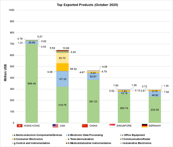 The top exported electronics products in October 2025 are in Fig. 4. Parts and accessories of data processing machines under Electronic Data Processing bound for Thailand rose by 47.09%. Meanwhile, Integrated Circuits bound for Hong Kong contracted by 44.32%. See Table 4.