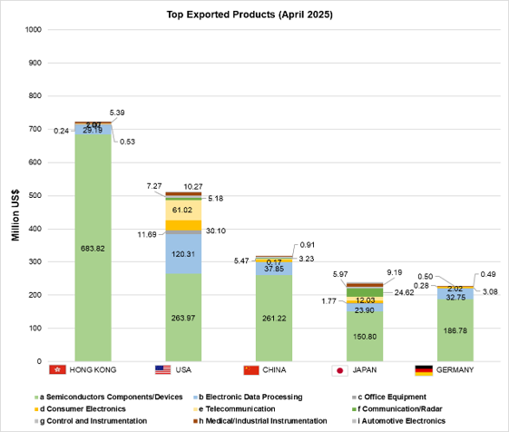 The top exported electronics products in April 2025 are in Fig. 4. Multi-component Integrated Circuits (MCO) bound for Hong Kong increased by 28.03%. Meanwhile, Integrated Circuits bound for Hong Kong decreased by 45.32%. See Table 4.