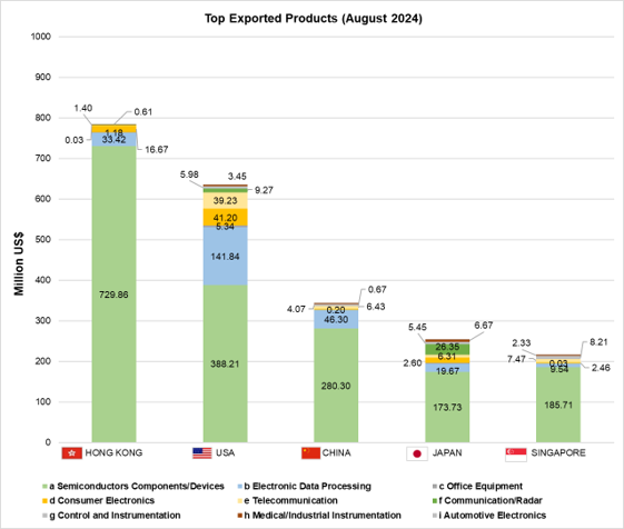 The top exported electronics products in August 2024 are in Fig. 4. Hard disk drives under electronic data processing bound for the USA rose by 72.10%. Meanwhile, Electronic Integrated Circuits – processors and controllers bound for Hong Kong contracted by 6.00%. See Table 4.