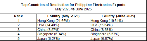 Table 1 shows the top five (5) export destinations in June 2025, namely, Hong Kong (19.61%), the USA (15.64%), China (8.58%), Singapore (6.63%), and Japan (6.57%). This was the same order for the countries of destination in May 2025.