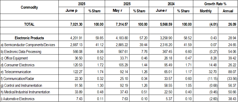 Electronics exports increased by 0.43% in June 2025 to US$ 4.20 billion, which is 59.85% of the US$ 7.02 billion total Philippine exports.