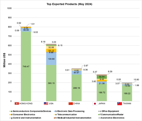 The top exported electronics products in May 2024 are in Fig. 4. Integrated Circuits bound for the USA rose by 55.47%. Meanwhile, Integrated Circuits bound for Hong Kong decreased by 44.11%. See Table 4.