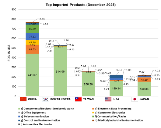 Electronics imports in December 2025 declined by 9.76% from US$ 2.95 billion in November 2025 to US$ 2.66 billion, which is 25.28% of the country’s US$ 10.52 billion total commodity imports.