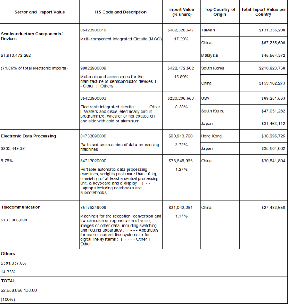 Imports in all sectors grew, led by Semiconductor Components/Devices at 20.07%, from US$ 18.50 billion to US$ 22.22 billion. It was followed by Communication/Radar (16.62%), Control and Instrumentation (14.53%), Electronic Data Processing (11.30%), Medical/Industrial Instrumentation (9.29%), Automotive Electronics (7.65%), Consumer Electronics (3.19%), Telecommunication (2.70%), and Office Equipment (2.17%). Kindly refer to Table 3.