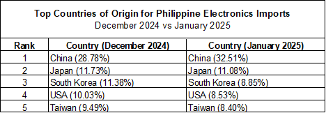 Table 1 shows that the top five (5) countries of origin of electronics imports in January 2025 were China (32.51%), Japan (11.08%), South Korea (8.85%), the USA (8.53%), and Taiwan (8.40%). These were likewise the countries of origin in the same order in December 2024.