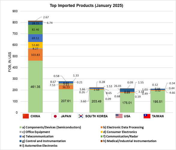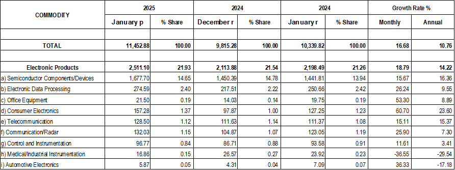 The country’s electronics imports increased by 18.79% from US$ 2.11 billion in December 2024 to US$ 2.51 billion in January 2025. See Fig. 1.