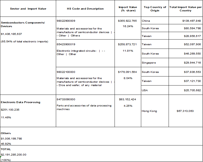 Imports in eight (8) electronics sectors went up, led by Consumer Electronics at 60.70%, from US$ 97.87 million to US$ 157.28 million. It was followed by Office Equipment (53.30%), Automotive Electronics (36.33%), Electronic Data Processing (26.24%), Communication/Radar (25.90%), Semiconductor Components/Devices (15.67%), Telecommunication (15.11%), and Control and Instrumentation (11.61%).